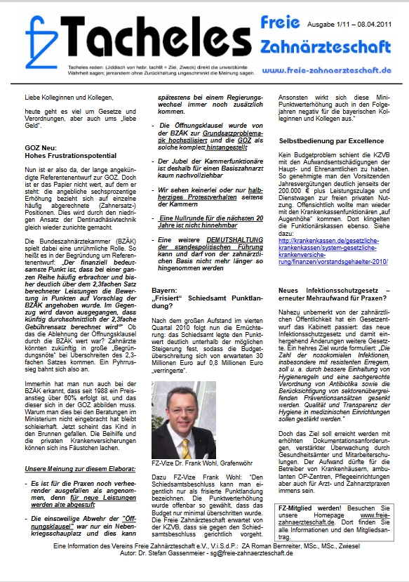 Tacheles 1/2011Dr. Stefan Gassenmeier28. Jan. 20241 Min. LesezeitSchwerpunkte: Referentenentwurf GOZ, Schiedsamtsbeschluss, IfSchG